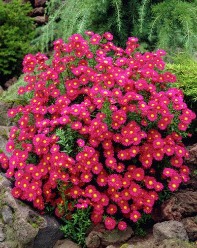 Цветки темно-красного, почти малинового цвета, сердцевина цветка ярко желтая. Куст 90-130 см высотой