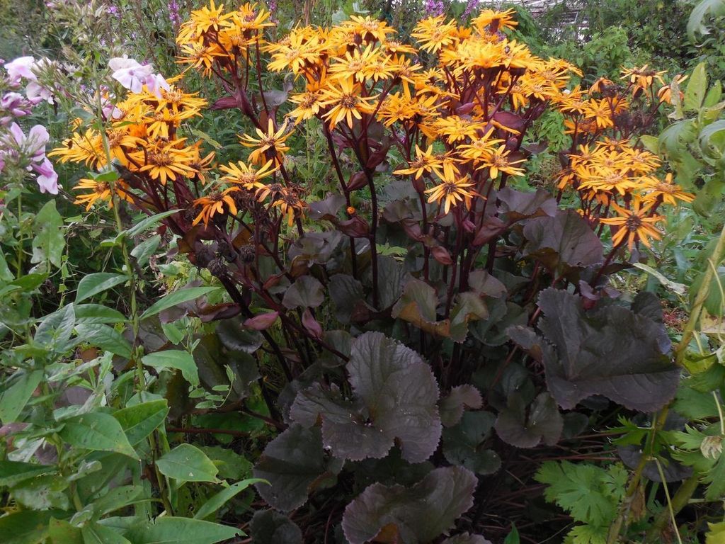 Эффектное растение до 40 см высотой, цветоносы до 80 см. Листья крупные, фиолетово-красные с изнаночной стороны, темно-зеленые снаружи з зубчатым краем. Соцветия - желто-оранжевые корзинки 7-8 с м в диаметре. Цветет в июле-сентябре.