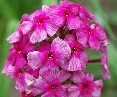 Флокс Хозяйка Медной Горы - пурпурно-малиновый с карминным глазком, яркий, по краю лепестков тонкая серебристая штриховка.