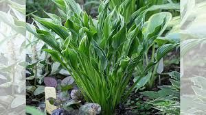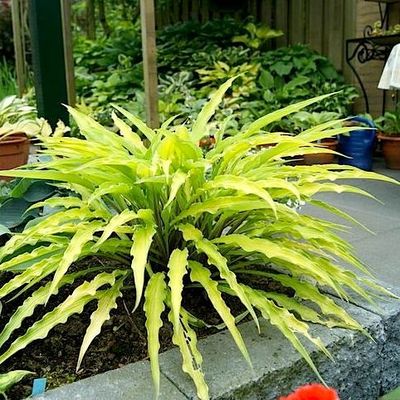 Хоста Керли Фрайз миниатюрный сорт.Имеет очень необычные узкие, длинные листья с эффектно струящимися краями и острым кончиком, расположенные на длинных черешках с бордовым краем у основания. Длина листа 14см, ширина 3 см. Структура плотная, высота 25-30 см.