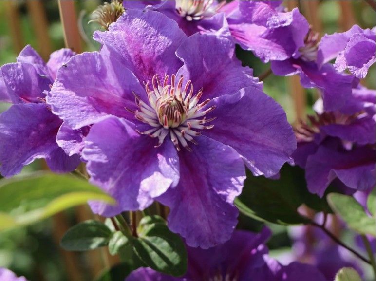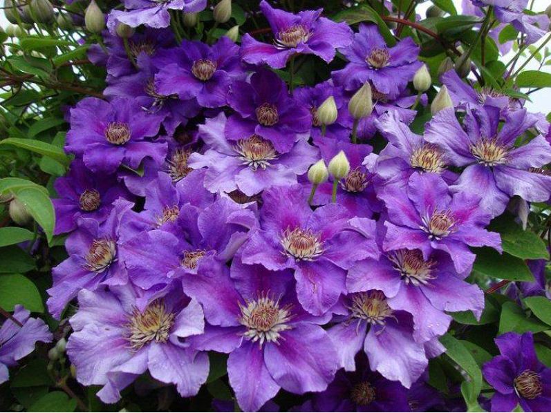 Ашва - изумительно красивый сорт, период цветения с июня по сентябрь (цветет на побегах текущего года). Цветение очень обильное и продолжительное. Растение вьющееся, высота клематиса от 1,5 до 2 метров. Цветки полосатые, крупного размера, пурпурного цвета с гофрированными краями, сердцевину цветка украшают пушистые тычинки более темного окраса. На зиму этот сорт клематиса требует сильной обрезки под корень. Высадку производят в южной, западной или восточной части участка. Можно выращивать: на балконах, в контейнерах, на террасах, в зимних садах и т.д. Очень красивое оформление беседок, стен, решеток, арок, сеток и т.д.