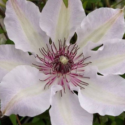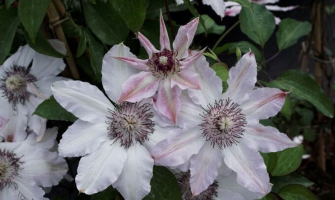 Клематис Фэйр Розамунд - шикарная лиана с белыми, ароматными цветками, с бледно-розовыми полосами, волнистыми лепестками, диаметром до 15 см. Высота взрослого растения достигает до 250 см. В июне начинает цвести на побегах прошлого года, цветки могут быть полумахровыми, цветение продолжается до сентября, на побегах текущего года немахровыми цветками.