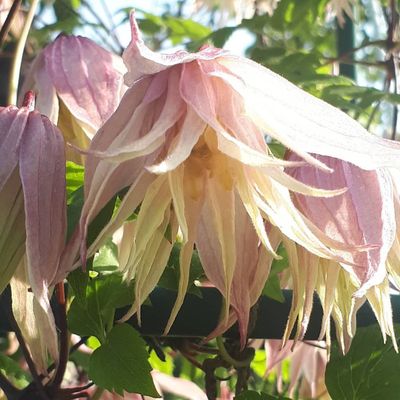 У княжина Пинк Свинг цветки всегда махровые – как на прошлогодних побегах, так и на побегах текущего года, относительно крупные для группы Атрагене (диаметром 10-12 см), колокольчикообразные, свешивающиеся, слегка приятно пахнущие грейпфрутом, сидящие на пурпурных цветоножках. Цветки складываются из 4 эллипсообразных, вытянутых, остро заканчивающихся со слегка волнистыми краями чашелистиков, на внешней стороне кремово-розовые, снизу светло-розовые , иногда почти кремового цвета. Цветет в мае и повторяет цветение, но уже менее обильно –летом. Имеет красивые темно-зеленые относительно крупные (до 23 см длиной и 19 см шириной) листья – тройные, тройчатосложенные, с красивой фактурой и зубчатыми краями листочками. Достигает высоты 2 – 3 м. За опоры цепляется листовыми черешками. Морозостоек и неприхотлив.