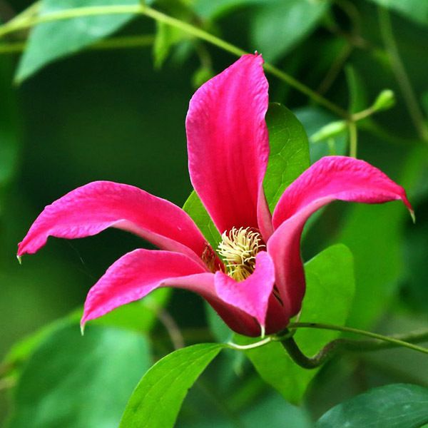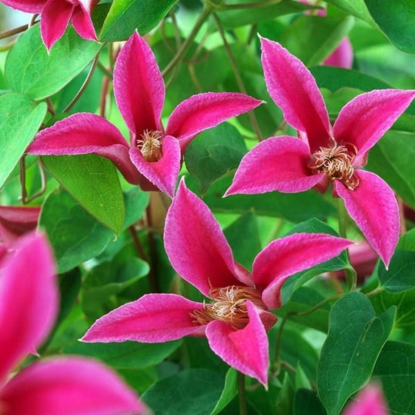 Принцесса Диана. У этого сорта клематиса необычные тюльпановидные цветы, состоящие из 4 лепестков слегка заострённой формы. Окрас у цветка розовый, очень насыщенный, иногда практически красный. Тычинки светлые, либо золотистые. Красивые цветы появляются начиная с середины июня. Длинный период цветения простирается до сентября и даже до октября, когда погода мягкая. Диаметр цветка от 5 до 6 см. Высота лианы до 280 см.
