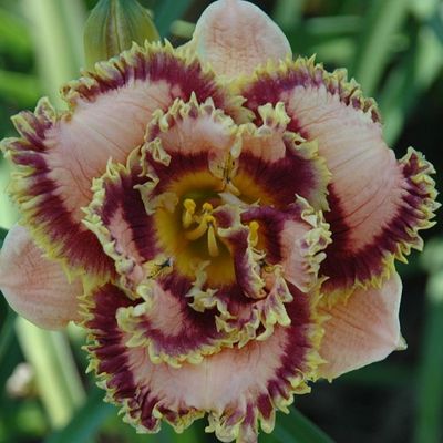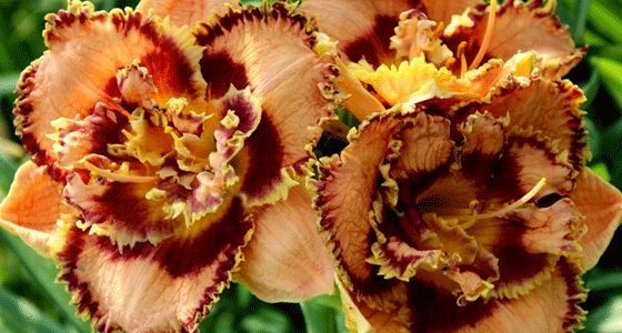 Лилейник Бонибраэ Шарки - с махровыми, нежно абрикосового, к середине лилового оттенка цветами до 12 см диаметром.