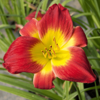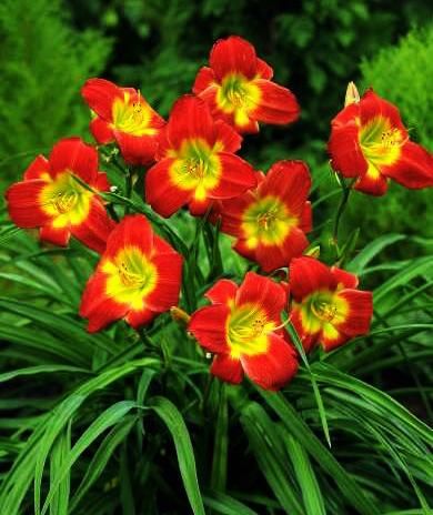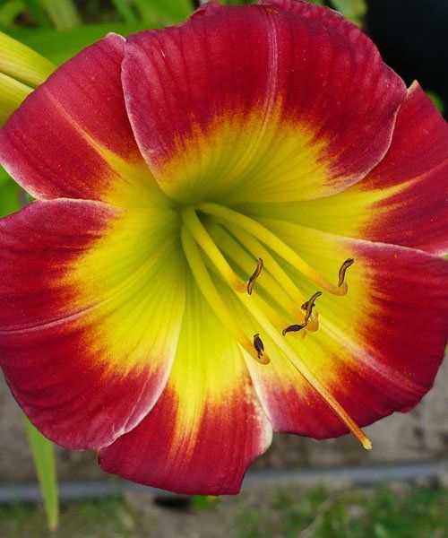 Лилейник Кристмас Из - "Рождество Это": яркий, нарядный куст с тёмно-красными, бархатистыми цветами, с очень широким светло-зелёным горлом до 12 см диаметром. Цветение начинается в июне и радует 30-45 дней.