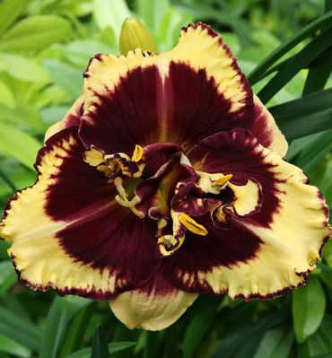Лилейник гибридный Тайгер Блад - Куст высотой до 65 см. Цветки крупные, кремово-желтые с большим темно-бордовым центром и каймой. Цветки сохраняют свою декоративность с весны до глубокой осени. На зиму растение можно не обрезать, достаточно мульчировать кусты торфом или травой. На одном месте может расти очень долго, образуя крупные, широкие кусты. Лилейник один из самых неприхотливых многолетников, он зимостоек и засухоустойчив, прекрасно растёт на хорошо освещенных участках.