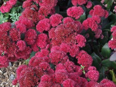 Куст компактный, густой, прямостоячий, высотой 25 - 35см, шириной 30см. Листья плотные, мясистые, блестящие, яркие, пурпурнозелёные. Цветение обильное и непрерывное с июля до осени. Щитковидное соцветие из мелких пурпурных цветов, цветение с июля до осени. Декоративен весь сезон, до самых морозов. Неприхотлив, зимует без укрытия. Раннецветущий сорт.