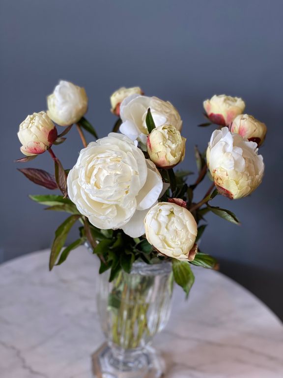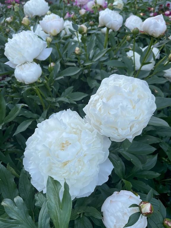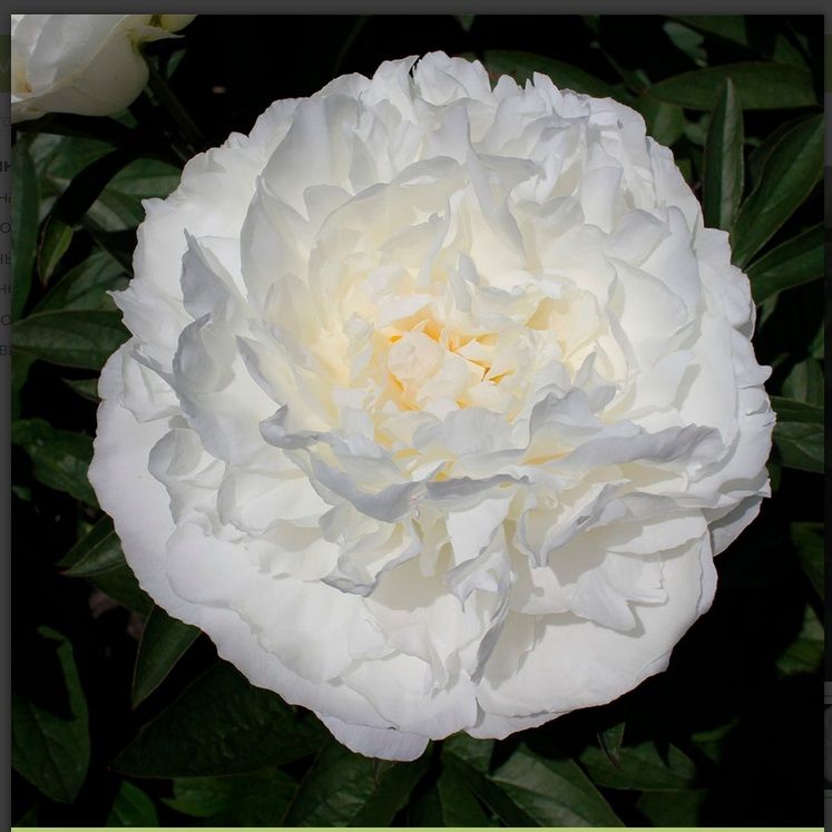 Пион Анна Казинс (Ann Cousins) — один из самых эффектных белых махровых пионов с сильным ароматом розы. Цветки очень крупные, до 17–20 см, густомахровые, розовидной формы, лепестки крупные, плотно и ровно уложены, окраска чисто‑белая без кремового тона. Аромат яркий, насыщенный, «парфюмерный» — сорт часто называют ароматной жемчужиной белой коллекции. Куст мощный, высотой около 80–90 см, с темно‑зеленой листвой; стебли сильные, но под тяжестью крупных бутонов могут слегка изгибаться, поэтому для идеальной картинки в цветении рекомендуется легкая поддержка. Цветение позднее, в конце сезона, обильно и стабильно, при хорошем уходе куст буквально усыпан крупными «розами».