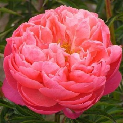 Пион Корал Чарм Гибрид. Раннего срока цветения. Бутон тёмно-абрикосовый. Цветок полумахровый, огромный, кораллово-персиковый, блестящий, при отцветании бледнеет до мандариново-жёлтого. В центре светло-жёлтые тычинки. На взрослом растении оновременно цветки различных оттенков. Куст высотой 90 см. Стебли сильные.