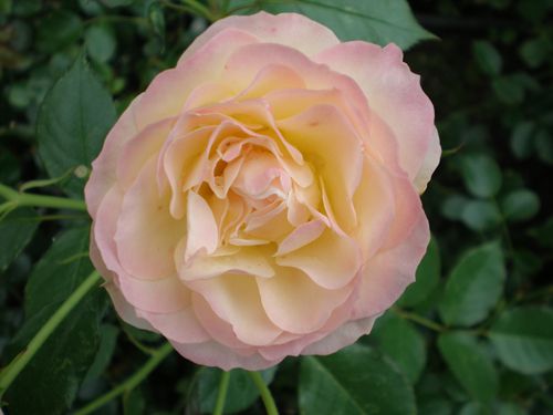 Куст компактный, густоветвистый, высотой 60-70 см, шириной 40-50 см, с глянцевыми светло-зелёными листьями и минимумом шипов. Цветки густомахровые (>40 лепестков), стартуют кремово-белыми, переходят в нежно-розовые, пастельные (зависит от погоды), не боятся дождя и долго держатся; цветёт волнами всё лето.