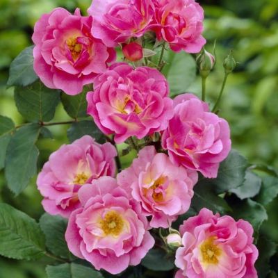 Роза Вильям Баффин Высота этой канадской розы 180-200 см, ширина 2 м. Роза Уильям Бэффин самая сильнорослая, надежная и зимостойкая из серии канадских роз «Исследователь». При благоприятных условиях эта роза может достигать и 3 метров. Куст у розы Ульям Бэффин прямостоячий, со слегка поникающими многочисленными плетистыми и ветвистыми побегами - идеально подходят для живой изгороди. Листва у этой розы толстая, блестящая. Диаметр цветка 6-7 см. Полумахровые цветки канадской розы Уильям Бэффин ярко-розового цвета, с золотыми тычинками и белыми потеками у основания собраны в больших кистях по 10-30 штук, которые покрывают куст в течение всего лета и осени. Обладает слабым ароматом. Эта канадская роза зимует хорошо (до -45 С), можно просто снять плети розы со шпалеры и положить на землю.