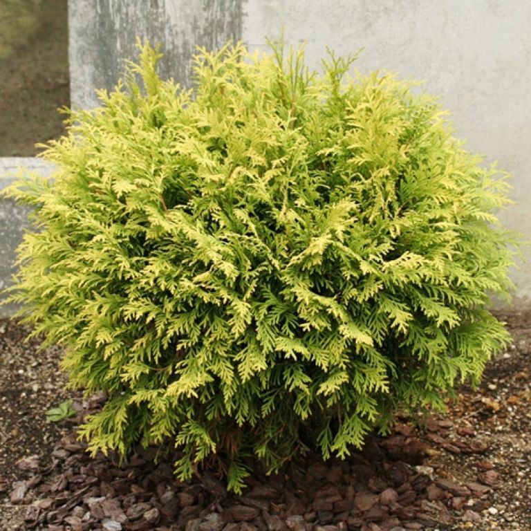 Туя западная Голден Глоб - сорт с шаровидной формой кроны. Высота 10-летнего кустарника около 0,8 м. К 20 годам достигает 1 м в высоту при диаметре кроны 1-1,2 м. Средний годовой прирост порядка 10 см. Хвоя достаточно рыхлая, золотистого цвета. Добиться плотности можно при помощи регулярной стрижки. Кончики побегов, которые получают достаточно солнца, имеют желтый цвет и полностью покрывают растение. Внутри этого желтого шара хвоя остается зеленой. Осенью туя приобретает медный оттенок, а весной снова – золотистый. Получить золотистую окраску Голден Глоб может только на солнечных местах или в полутени. Зимоустойчива.